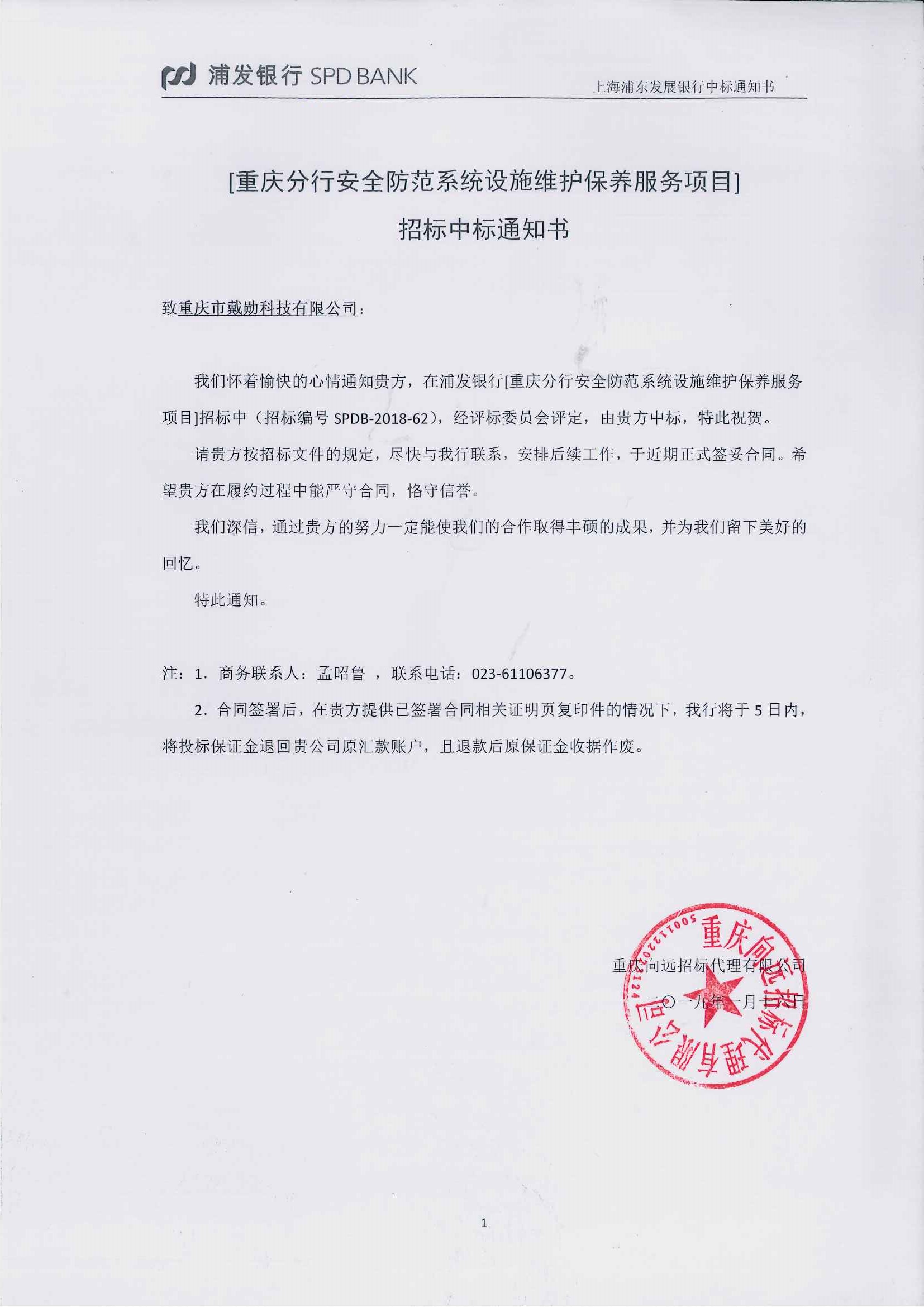 1、我公司中標(biāo):浦發(fā)銀行重慶分行2019年度安全防范(監(jiān)控)系統(tǒng)設(shè)施維護(hù)保養(yǎng)服務(wù)。